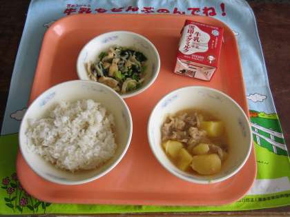 麦ごはん・牛乳・肉じゃが(ピリカラみそ味)・小松菜と切干大根の煮びたし