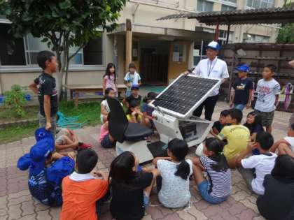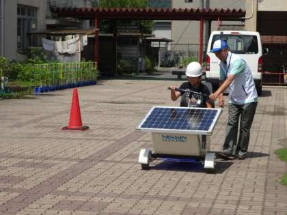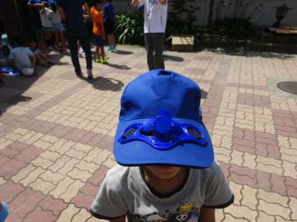 日新電機の方々に来ていただき,一緒に学習をしました。まずは屋外でのソーラーカー試乗体験。一人ずつ全員試乗させてもらうことができました。待っている間には,ソーラーの力で動く扇風機の付いた帽子をかぶらせてもらい,暑い中での試乗体験を思い切り楽しませてもらいました。