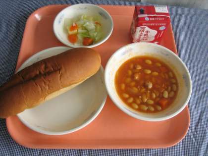 黒糖コッペパン・牛乳・大豆と鶏肉のトマト煮・野菜のソテー