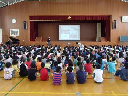 まずは朝のまとめの会,全校朝会から1日が始まりました。校長先生からは,1年生の入学からこの日までの成長の喜びと,3つの宿題が出されました。