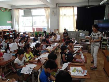教室に入ると1年生の子どもたち,元気いっぱい,やっぱりサマースクールの時よりも,子どもたちがみんな揃うとエネルギーが違います。