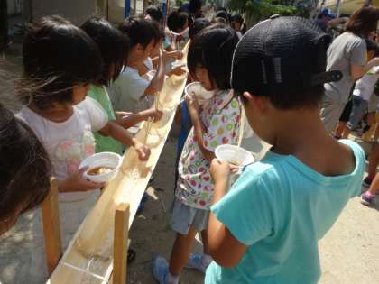 最後は流しそうめんです。本校おやじの会の梅北倶楽部のお父さん方が中心になってすすめてくれました。カレーライスにかき氷と食べて,みんなおなかいっぱいなはずなのに,次々と流れてくるそうめんをあっという間に食べてしまいました。