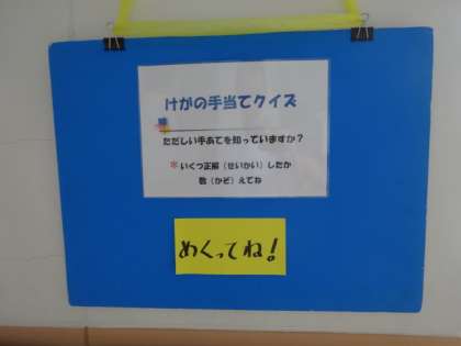 保健室前に新しい掲示がされているのに気付いていますか?けがをしたときにどうしたらいいか,クイズ形式でわかりやすく説明してくれています。運動会の練習や外遊びなどで元気いっぱいにみんな活動していますが,もしけがをしたときは,自分でできることは自分でしてから保健室へ来れるようになるといいですね。