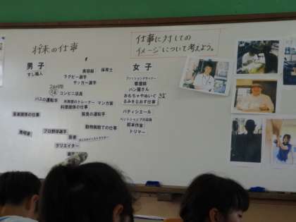 4年生は,自分が将来つきたい仕事について出し合い,「男だから」「女だから」ということにとらわれずに,自分のつきたい仕事についたらいいのだということを考えました。