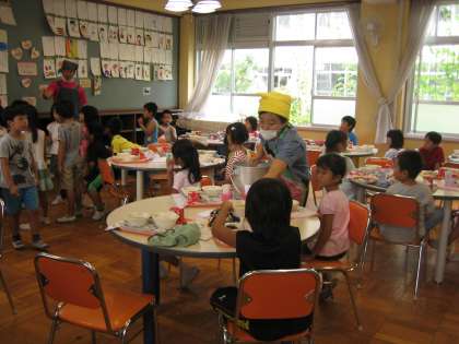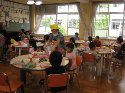 2年2組は今週はランチルームでの給食でした。木曜日は栄養教諭の早田先生と調理員と一緒に頂きました。