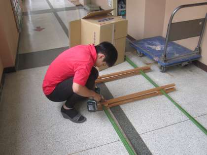 1年生の団体競技は、おみこしをリレーします。管理用務員さんが、丈夫なおみこし台を製作中です。