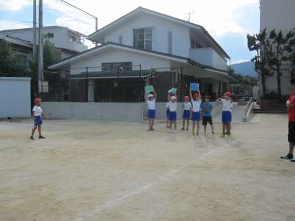 4年生の障害走は、ハードル走です。ハードル間を3歩で走れるように、自分の歩幅にあわせたハードルの間隔を色で知らせます。