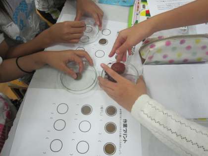 科学クラブは、10円玉を、身近なものできれいにしよう、という実験に取り組みました。しょう油や酢、梅干し等台所にある物でもピカピカになりました。