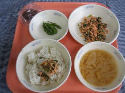 麦ごはん・さけとだいこん葉のまぜごはん(具)・えだ豆・みそ汁・おはぎ