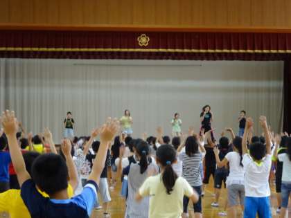 4〜6年生の高学年が体育館に集まり,準備体操の練習をしました。係の子を中心に各クラスでもこれまで練習してきているようで,音楽に合わせてリズミカルに体を動かしていました。全校のみんなで踊るのが今から楽しみです。
