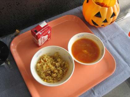 本日の献立は台風献立でした。「カレーピラフ」はカレー味で食べやすく、「トマトスープ」は玉ねぎとホールトマトをしっかりと炒め煮込まれました。最後にマカロニも入り美味しかったです。