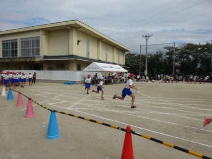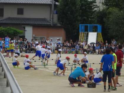 4年生「ハードル走」 自分が走りやすいインターバルでリズミカルにハードルをまたぎ越していきます。