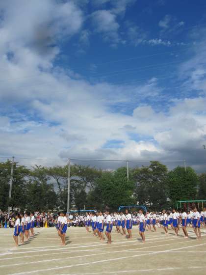 運動会当日は、予報では午後から雨。教職員一同心配していましたが、何とか曇りで進みました。その上、5・6年生の組体操が始まると、青空が広がりました。お日様も、梅津北小の子どもたちの頑張りに答えてくれたのかもしれません。