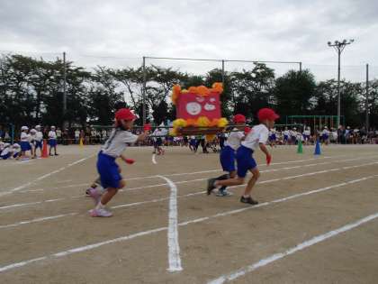 1年生の最初の種目は「みこしだワッショイ!」。練習の通りおみこしを担いで走ります。今日は西総合支援学校からの交流生も交え,一丸となって疾走。結果は紅組の勝ちでした。