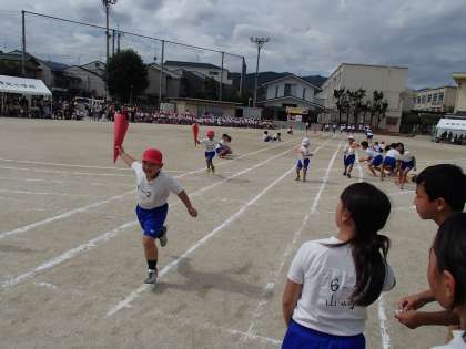 昼食後は50m走。一人一人が次々とゴールのアーチを駆け抜けて行きます。この半年の歩みや成長を振り返ると,こみ上げるものがあります。