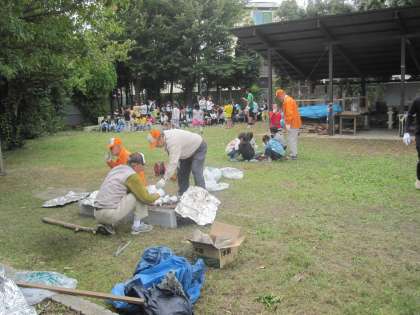 先日掘り起こしたサツマイモを、地域の皆さんにお手伝いいただいて焼き芋にしました。