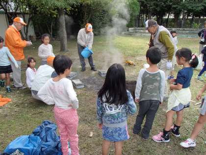 中間休みにみどりの広場の方から煙が上がっているのが見えました。1年生の子どもたち,「なんだなんだ!?」と興味津々。連れ立っていってみると,