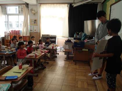 給食を食べていると,給食委員会の子どもたちが給食の片づけの仕方を教えに来てくれました。さわやかで丁寧な高学年の子どもたち,とってもやさしかったです。