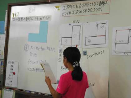 4年生は算数「面積」の学習です。正方形や長方形の面積の求め方をこれまで学習してきました。今回は,正方形や長方形でない形の面積をどのようにしたら求められるかみんなで考えました。これまで学習してきたことを生かしながら考えました。そして自分が考えた方法を友だちに伝えたり説明したりしたりして学習を深めることができました。