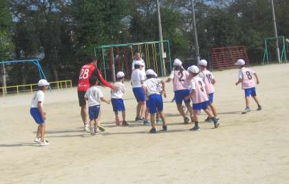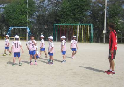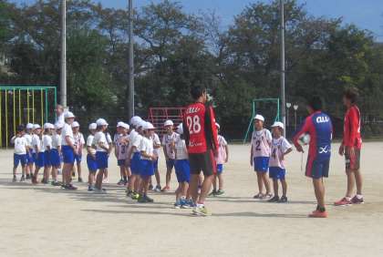 サッカー、パープルサンガの選手と交流しました。選手の方々は、教職員よりも頭1つ大きい方です。