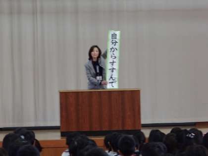 「こんな風になりたい。」と,「自分から進んで」「粘り強く取り組む」ことが,夢に近づくために大切なことだと,お話しして頂きました。