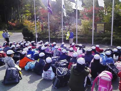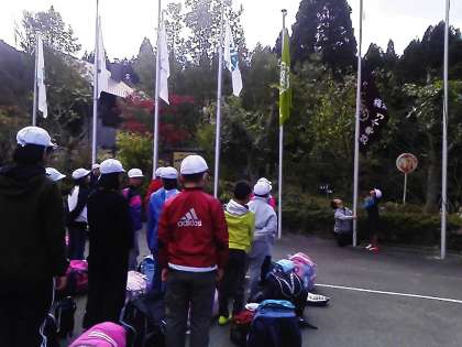 入所式です。所員の方とハナコロちゃん(山の家のマスコット)から諸注意を聞いています。