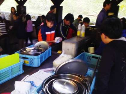 野外炊事がスタートしました。飯盒でご飯を炊き,そして豚汁を作ります。