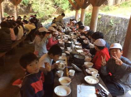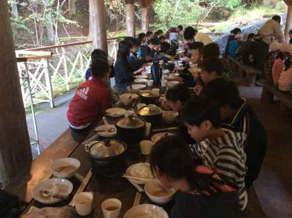 全部の班が、うまく炊けました!豚汁と少し柔らかめのご飯。みんなで作ってみんなで食べると本当に美味しいです。手早く作れて、16:30に食べ始めています。
