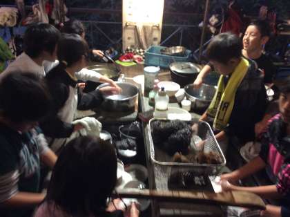 食事も終わり、みんなで後片付けです。冷たい水ですが、お湯に手をつけながら頑張って煤を磨いています。