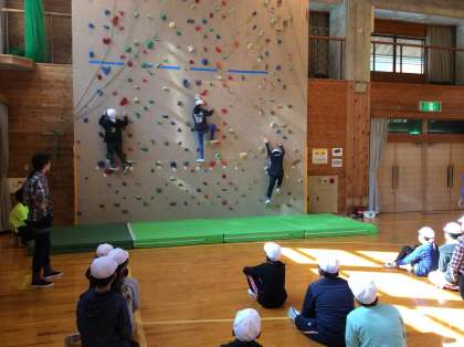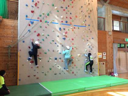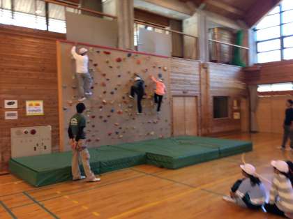 プレイホールでボルダリングのチャレンジが始まりました。身軽な子供たち。すいすい登っていきます。