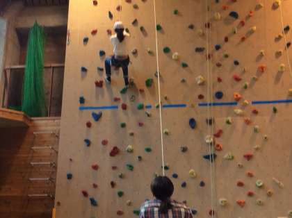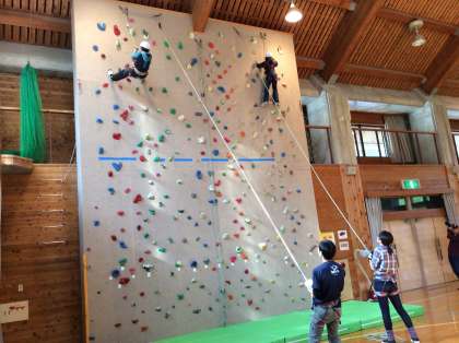 2クラスともクライミングに挑戦です。6mの高さまで登り、上についている鈴を鳴らします。登るより降下のほうが随分難しそうです。