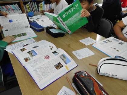 6年生は図書館司書の先生と一緒に,百科事典を使って調べる学習をしました。学校には読書する本だけでなく調べ学習に使う本もたくさんあります。最近ではインターネットを使って調べることが簡単にできますが,学校では図書を活用した調べ学習も大切にしています。