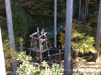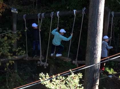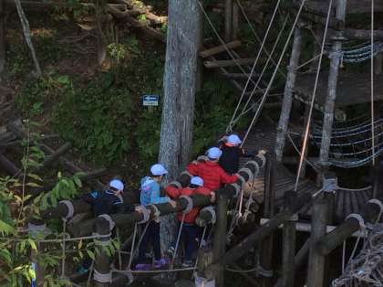 昨日とはうって変わって穏やかで暖かな日です。最後の野外活動、冒険の森のアスレチックにチャレンジしています。遊びのルールを守って、怪我のないように…。