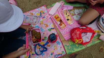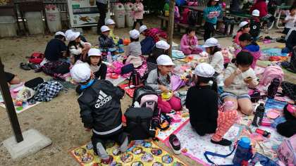 お弁当タイムです。朝からお家の方が用意していただいたお弁当を,みんなでおいしくいただきます。