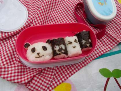 ご家庭のお弁当に舌鼓を打つ子どもたち。動物のお弁当もあり,ご家庭のお気持ちをパワーに変え,さあ午後出発!・・・というところで雨が降ってきてしまいました。