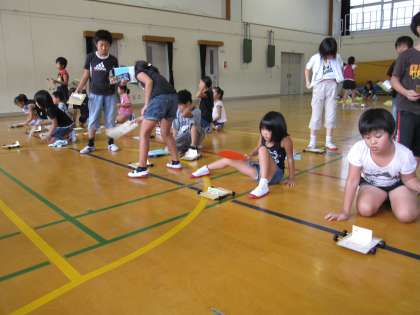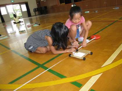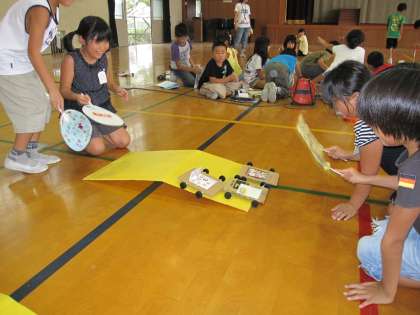 当てる風の強さによって車の走るようすが変わるのか、予想をたてて実験しました。風を受けて勢いよく走る車に、歓声が上がりました。他にも、坂を登らせたり、得点ゲームをして楽しく学習しました。