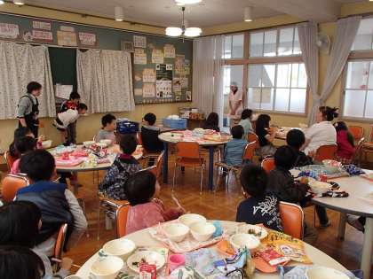 「5時間で409人分の給食を作っています。」「えーっ!」