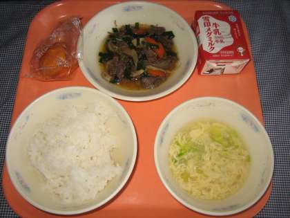 ごはん・牛乳・プルコギ・レタスと卵のスープ・柿