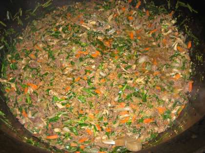 「プルコギ」は大人気の献立の一つです。にんにく・しょうが・しょう油で下味をつけた牛肉と人参・玉ねぎ・にら・まいたけが入り甘辛い味つけになっています。