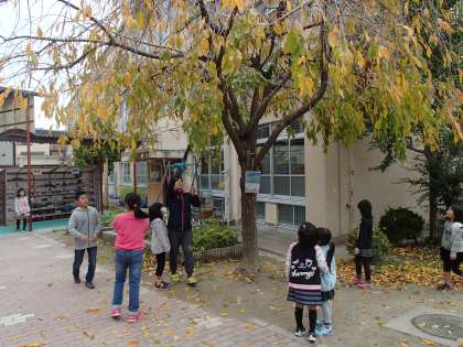 朝休みに運動場へ向かう途中,子どもたちが木の下で集まって上を見上げていました。用務員さんが,送風機で色づいた葉を吹き落としているところでした。はらはら〜と葉っぱが舞うたびに子どもたちの顔もはらはら〜と揺れます。何とも言えない穏やかさです。