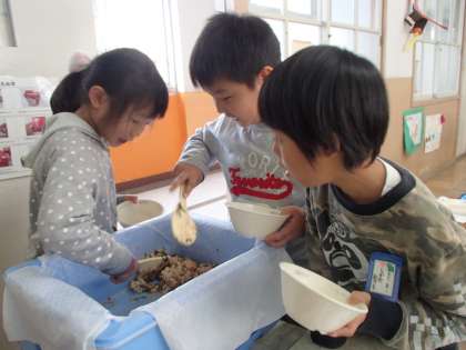 と,さすがに6枚使いきれずあまった子は,こっそり海苔だけ丸めて食べていました。本当に1年生はおいしそうに給食を食べます。見ていてにっこりしてしまいます。