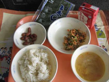 麦ごはん・牛乳・セルフおにぎり(具・さけとだいこん葉)・金時豆の甘煮・豚汁・手巻のり