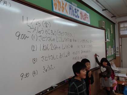 当日は一緒に楽しめるように,学級会で当日の打ち合わせをしました。まずは中間休みのみんなあそびを決めました。みんなで出来るように,かくれんぼをすることにしました。