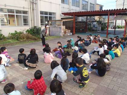 と全体に声をかけて出発すると,次々に発見したものを伝えに来てくれる子どもたちです。