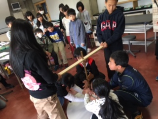 大きなコマを長い時間回す挑戦をしています。回す人、支える人、記録する人など計7人がかりで頑張っています。4分20秒を越え、科学館の方に素晴らしい記録だと褒めていただけました!子どもたちはいきいきとした表情で活動しています!