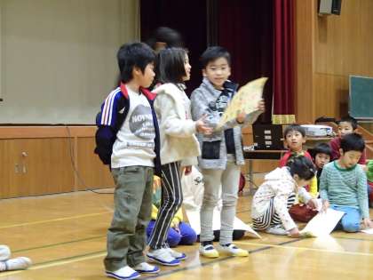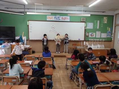 今日は人権朝会。人権目標を全校の前で発表しました。「人権」というと1年生の子どもたちにはとても難しいですが,お話や読み聞かせを通して,「友達にやさしくすること」を大切に生活してほしいと思います。
