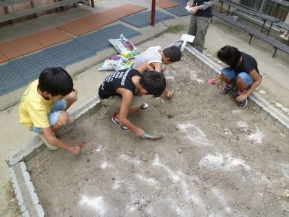 夏野菜の植えてあった場所の土に肥料をまいて、みんなでよく混ぜました。