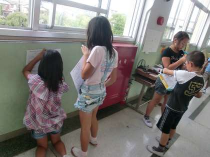 実際に学校を探検し,消火栓や火災報知機,非常階段,消火バケツを見つけました。