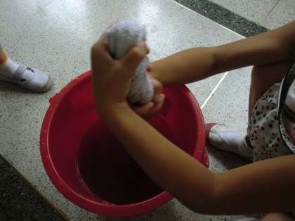 子どもたちが一番苦労していたのが,ぞうきんのしぼりかたです。