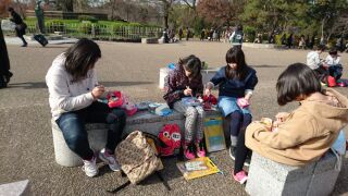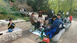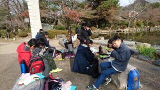 円山公園で昼食のグループが、全てそろいました。ちょっと道に迷い、人に尋ねてやって来た班もありましたが、体調が悪い人もいず、みんな無事でした。たくさん歩いたからか、みんな空腹です。朝から作っていただいたお弁当をいただいています。